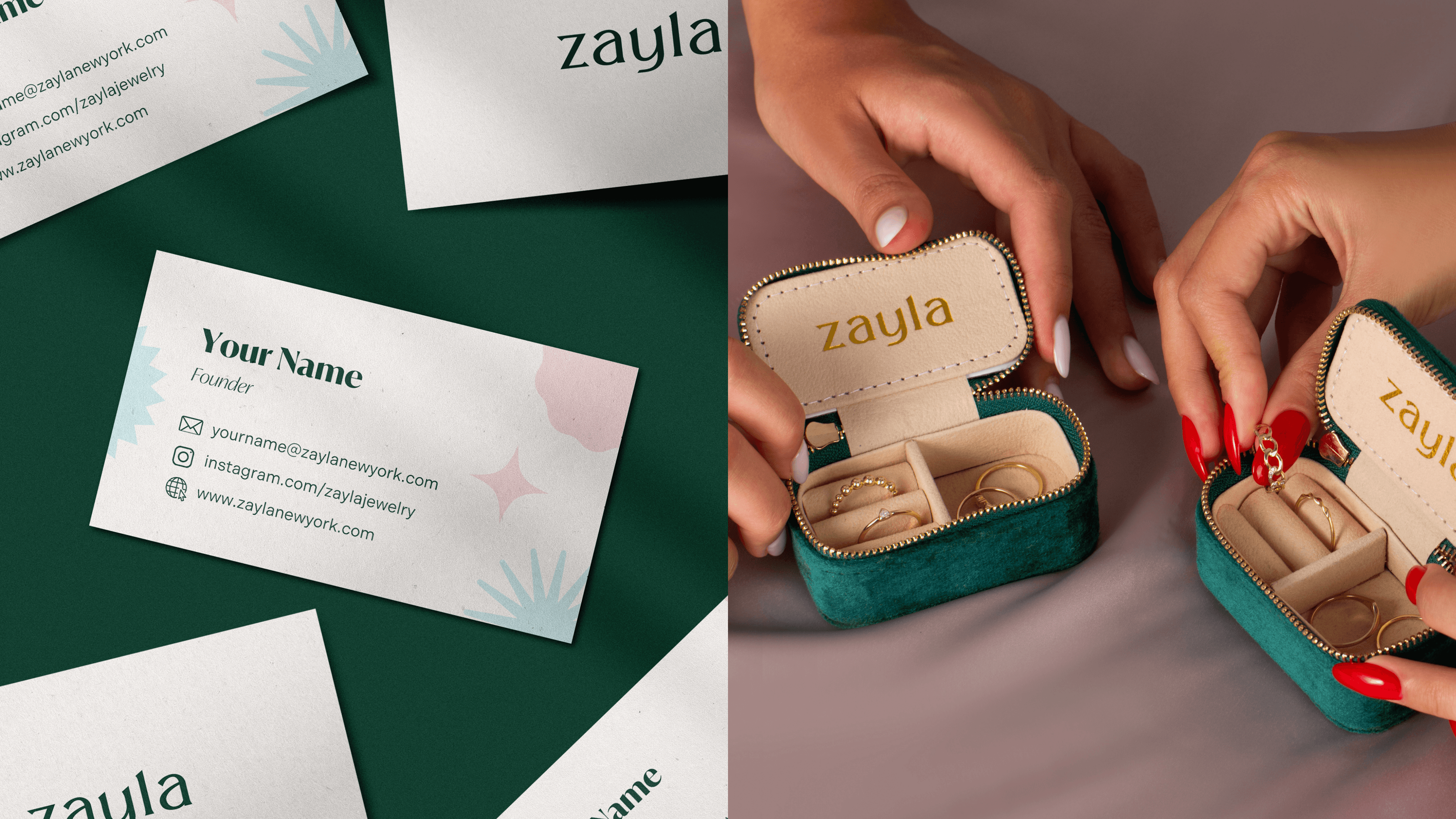 I developed the full brand identity for Zayla, a fine jewelry brand creating 14k solid gold pieces made to be worn every day. From the logo to the color palette, every detail was shaped around Zayla’s idea of making luxury feel effortless and approachable.